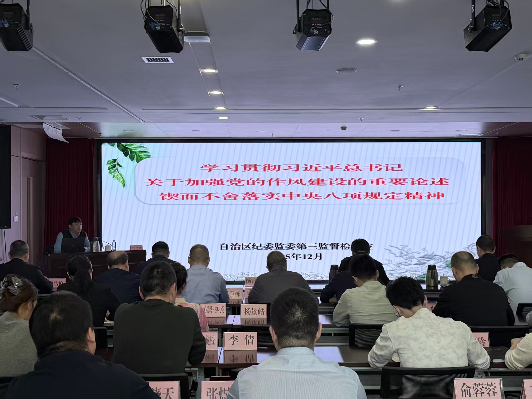 任洪智副主任带领大家从“六个深刻领悟”系统学习习近平总书记关于加强党的作风建设的重要论述,深入了解推进党的作风建设取得的显著成效,进一步分析当前作风方面存在的七类突出问题,提出从强化理论武装、政治责任、问题导向和站稳人民立场四个方面巩固拓展学习教育成果,持续纵深推进作风建设走深走实。授课以理论为基础,从党中央、自治区查处的违反中央八项规定精神典型案例为切入点,深入浅出,让理论具象化。