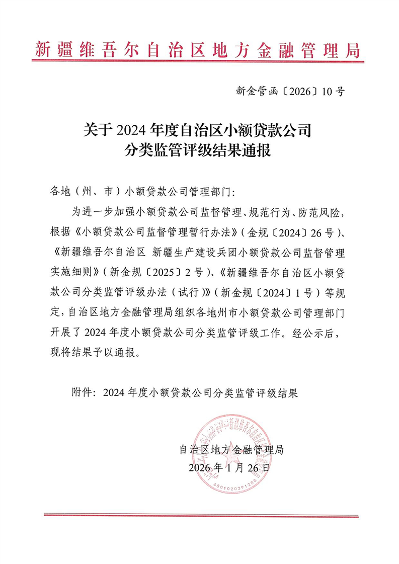 关于2024年度自治区小额贷款公司分类监管评级结果通报